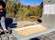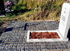 Замываем брусчатку и снимаем с надгробья защищающий надпись и фотокерамику скотч, протираем памятник от строительной пыли.